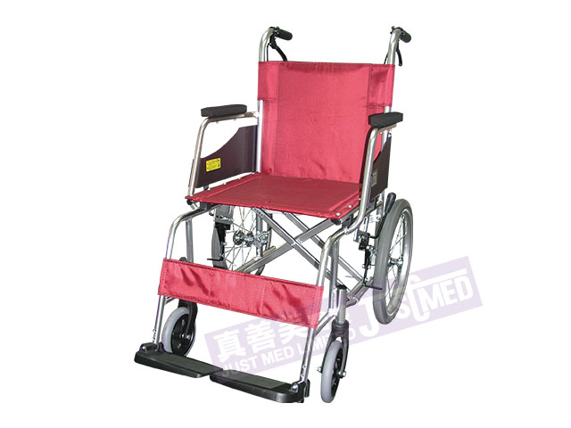 .支架: 銀色7003-T5高強度航太鋁合金.座墊: 棗紅色(S-2)尼龍布.座闊: 18".座深: 15".座高: 17".總闊: 22".重量: 9.5kg.承重: 100kg.前輪: 6"實心輪胎.後輪: 14.5"PU輪胎.扶手: 固定、標準長度.腳踏: 固定、腳踏板、可3段調整.附有手剎